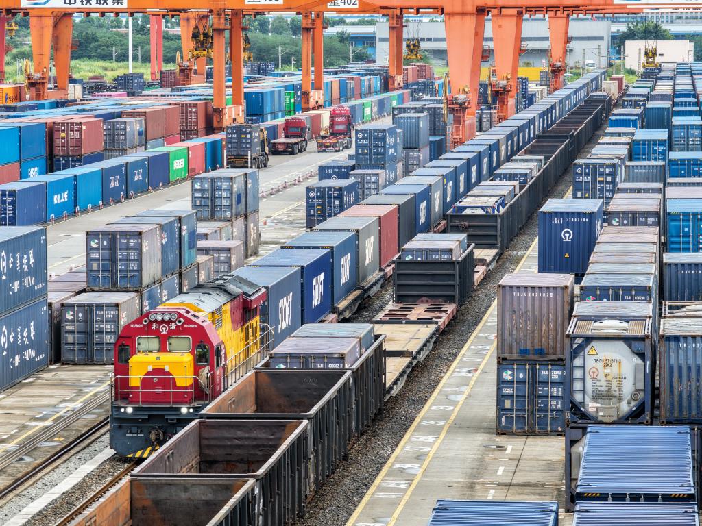 2025年9月8日,满载“重庆造”汽车的中欧班列(成渝)在重庆团结村中心站等待发车(无人机照片)。 新华社记者 唐奕 摄