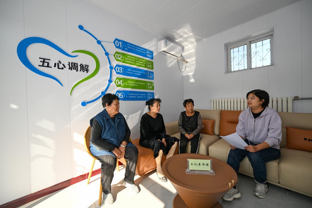 在天津市宁河区芦台街道金华路社区,社区党总支副书记吴蕊(右一)就社区监控设备安装问题为社区居民进行解答(2024年10月11日摄)。金华路社区积极践行新时代“枫桥经验”,将原社区居委会闲置用地提升改造成为联络群众的基层综合治理阵地——“解铃小院”。 新华社记者 孙凡越 摄